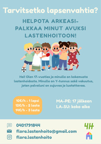 Olen 17-vuotias ja minulla on kokemusta lastenhoidosta. Minulla on Y-tunnus sekä vakuutus,