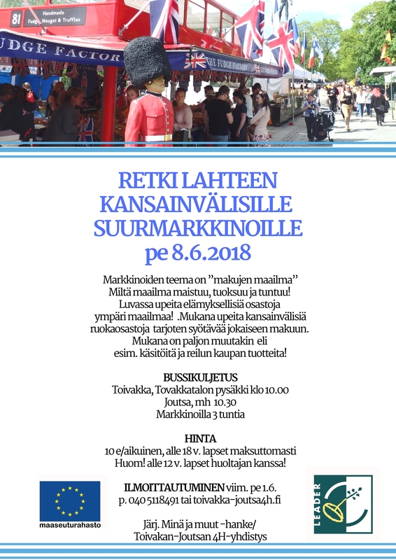 Markkinoiden teema on ”makujen maailma” Miltä maailma maistuu, tuoksuu ja tuntuu! Luvassa upeita elämyksellisiä osastoja ympäri maailmaa! .Mukana upeita kansainvälisiä ruokaosastoja tarjoten syötävää jokaiseen makuun. Mukana on paljon muutakin eli esim. käsitöitä ja reilun kaupan tuotteita! BUSSIKULJETUS HINTA ILMOITTAUTUMINEN viim. pe 1.6. Järj. Minä ja muut -hanke/ |