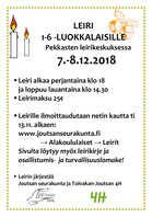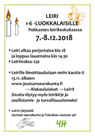 Leiri alkaa perjantaina klo 18 ja loppuu lauantaina klo 14.30 Leirimaksu 25€ Leirille ilmoittaudutaan netin kautta ti 13.11. alkaen: www.joutsanseurakunta.fi → Alakoululaiset → Leirit Sivulta löytyy myös leirikirje ja osallistumis- ja turvallisuuslomake! Leirin järjestää Joutsan seurakunta ja Toivakan-Joutsan 4H