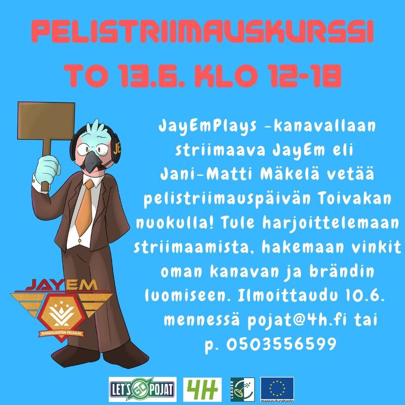JayEmPlays -kanavallaan striimaava JayEm eli Jani-Matti Mäkelä vetää to 13.6. klo 12-18 Toivakan nuokkarilla pelistriimauspäivän. Tule harjoittelemaan striimausta, kuulemaan vinkit striimauslaitteiston vaatimuksista ja oman kanavan perustamisesta ja kehittämään omaa persoonallista tapaa striimata. Mukaan tarvitset vahintään muistiinpanovälineet, mutta parhaan hyödyn päivästä saat ottamalla mukaan oman tietokoneen, konsolin ja striimattavan pelin. Ilmoittautumiset 10.6. mennessä pojat@4h.fi tai p.0503556599. Järj. Let's go pojat -hanke. |