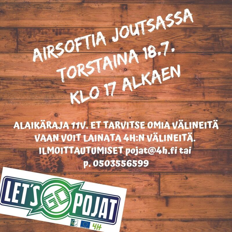 Tule pelaamaan torstaina 18.7. klo 17 Airsoftia Joutsaan, Pellonpään soramontulle. Alaikäraja 11 v. Et tarvitse omia välineitä, vaan voit lainata 4H:n välineitä. Osallistujia tarvitaan vähintään 6, jotta peli järjestetään. Ilmoittaudu ennakkoon pojat@4h.fi tai p. 0503556599. Järj. Let's go pojat -hanke. |