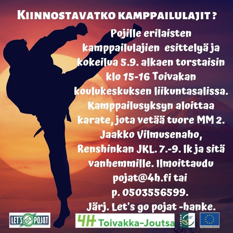 Pojille erilaisten kamppailulajien kokeilua ja esittelyä torstaisin klo 15-16 Toivakan koulukeskuksen liikuntasalissa 12.9. alkaen. Kamppailusyksyn aloittaa karate, jota tulee vetämään tuore MM hopeamitalisti Jaakko Vilmusenaho, Renshinkan Jyväskylä. Ikäraja: 5. luokasta ylöspäin. Ilmoittaudu mukaan pojat@4h.fi tai p. 0503556599. Järj. Let's go pojat -hanke. |