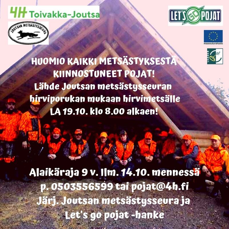 Joutsan metsästysseura ja Let's go pojat -hanke järjestävät yhteistyössä poikien hirvestyspäivän lauantaina 19.10. klo 8 alkaen. Päivä on suunnattu metsästyksestä kiinnostuneille pojille ja alaikäraja on 9 vuotta. Metsästysreissu päättyy iltapäivällä. Pojat saavat metsässä eväät (makkaraa, leipää ja lämmintä juomaa). Säänmukainen ja metsässä liikkumiseen sopiva varustus. Ilmoittautumiset p. 0503556599 tai pojat@4h.fi. Nopeimmin ilmoittautuneet mahtuvat mukaan. Tapahtuma on maksuton. |