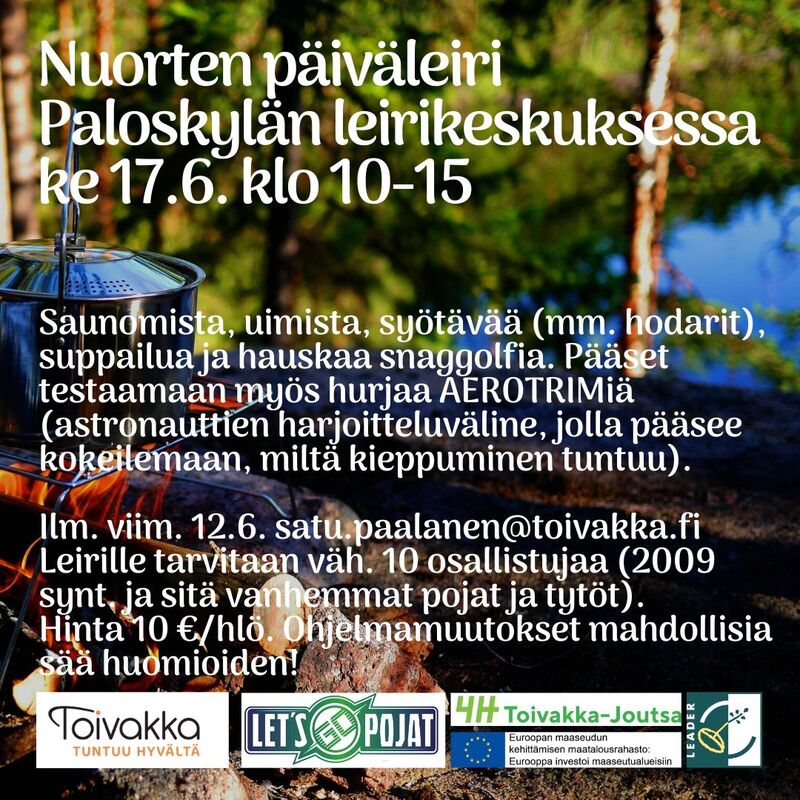 Tule mukaan nuorten päiväleirille ke 17.6. klo 10-15 Paloskylän leirikeskukseen. Paikalla hurja AEROTRIM, joka on astronauttien harjoituslaite. Ohjelmassa myös saunomista, uimista, suppailua ja snaggolfia. Syötävää, mm. hodarit ja letut. Leiri on vuonna 2009 syntyneille ja sitä vanhemmille pojille ja tytöille. Ilm. viim. pe 12.6. satu.paalanen@toivakka.fi. Leirimaksu 10 €. Leiri toteutuu, jos osallistujia on väh. 10. Leiriohjelma voi muuttua kelien mukaan. Järj. Let's go pojat -hanke ja Toivakan kunnan vapaa-aikatoimi |