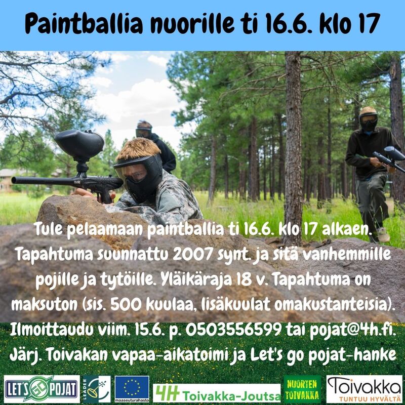 Tule mukaan pelaamaan paintballia ti 16.6. klo 17 alkaen. Tapahtuma on maksuton 500 kuulaan asti ja lisäkuulat ovat omakustanteiset. Tapahtuma on suunnattu 2007 synt. ja sitä vanhemmille. Yläikäraja on 18 v. Ilmoittaudu viim. 15.6. p. 0503556599 tai pojat@4h.fi Järj. Toivakan kunnan vapaa-aikatoimi ja Let's go pojat -hanke |