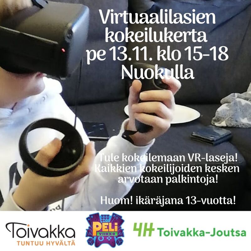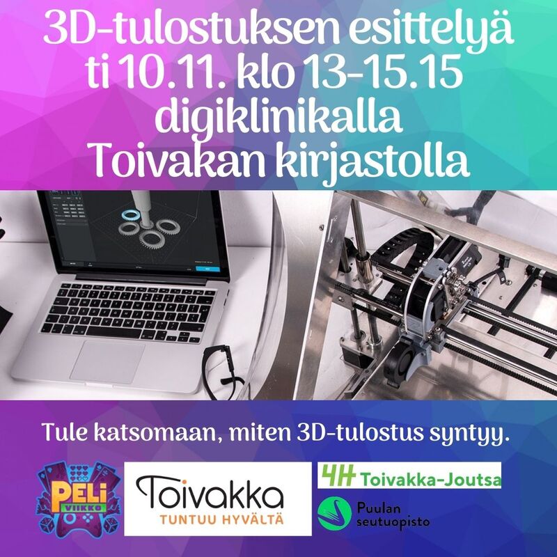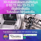 Ti 10.11. pääsee tutustumaan 3D-tulostukseen. Ke 11.11 tarjotaan pakopelikokemusta kirjastolla. Pe 13.11 nuokulla pääsee testaamaan VR-laseja.