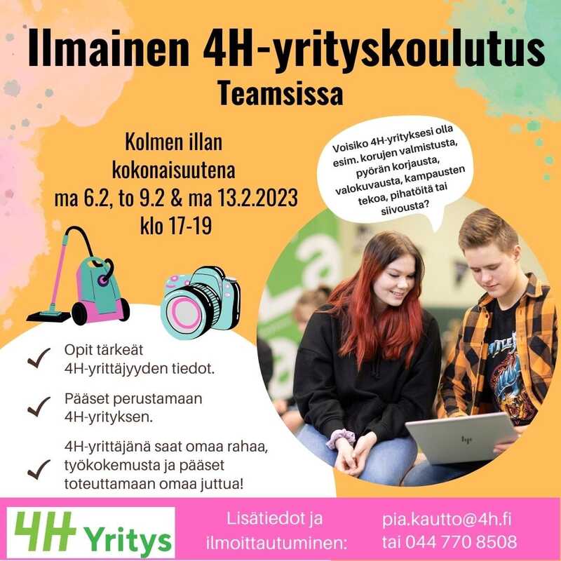 4H-yrityskoulutus Teamsissa kolmen illan kokonaisuutena 6.2., 9.2. ja 13.2. klo 17-19