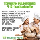 Puuhakerho kokoontuu tiistaisin klo 15-16 4H:n toimitilassa. Kerhon ohjelmassa on kädentaitoja ja kokkailua. Kerho starttaa, kun uusi ryhmä on kasassa. Ilmoittaudu mukaan p. 040 5118491