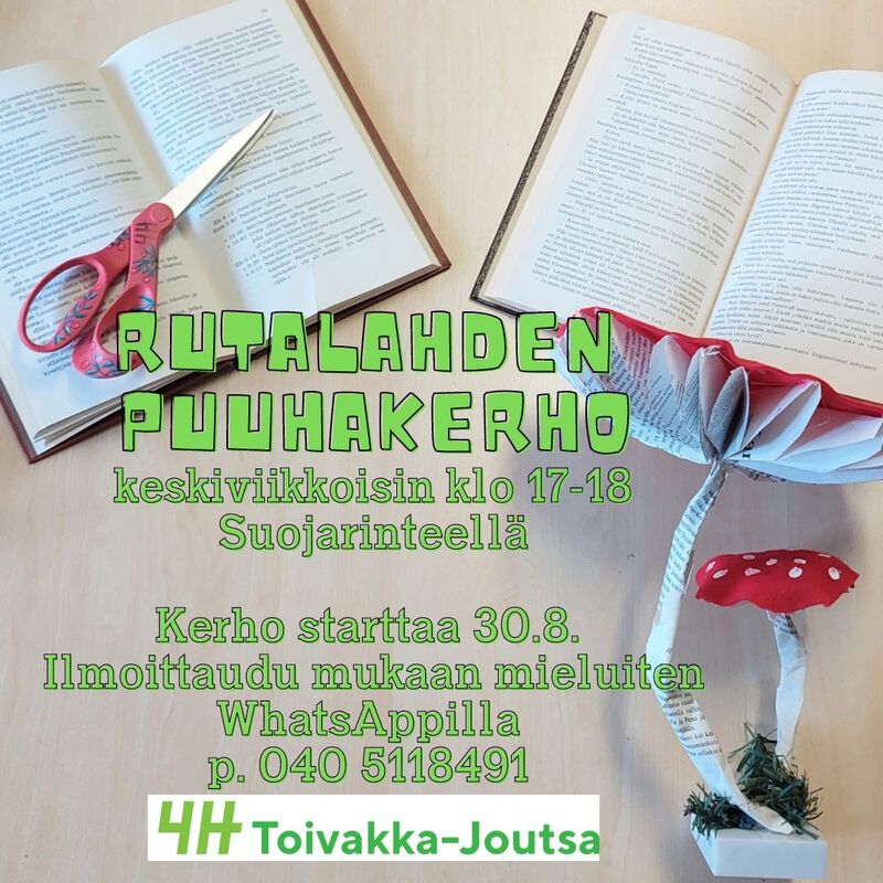 Iloisia uutisia Rutalahden lapsille! 4H:n puuhakerho palaa kylälle monen vuoden tauon jälkeen. Puuhakerho tarjoaa monipuolista tekemistä 7–12-vuotiaille. Meillä on tiedossa kokkailua, kädentaitojen opettelua ja yhdessäoloa. Ilmoittaudu mukaan luomaan onnistumisen hetkiä ja oppimaan yhdessä! Ilmoittaudu mukaan mieluiten WhatsAppilla |