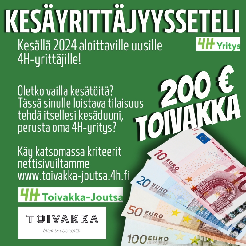Etsitkö kesätyötä? Käy tsekkaamassa myös tämä mahdollisuus, jos yrittäjyys kiinnostaa ja haluat olla itse pomo ensi kesänä! Toivakan kunta @toivakkagram @toivakanhyvinvointipalvelut myöntää kauttamme neljälle nuorelle kesäyrittäjyyssetelin! Setelin avulla kannustetaan ja autetaan nuoria tekemään itselleen kesätyö 4H-yrittäjänä! Ja yrittäjyyden ei edes tarvitse loppua kesään vaan 4H-yrityksen kautta voit jatkossakin hankkia itsellesi omaa rahaa vaikka opiskeluihin! Käy tsekkaamassa nettisivuiltamme lisäinfot aiheesta! |