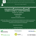 12.15-14.00 Koululaisten vierailu tapahtumassa 12.00-14.00 Monitoimiyrittäjä, Matti Tiainen, Toivakka 14.00-15.00 Yrittäjyyspäivän asiantuntijapalveluiden esitykset ja esittely Paikalla: Keski-Suomen TE –toimisto: 12.00-18.00 Eveliina Seppänen, Keski-Suomen TE –toimisto 14.00-16.00 yritysasiantuntija, Lauri Myllyoja, Keski-Suomen TE –toimisto 4H yhdistys: 12.00-14.00 2 4H-yrittäjää kertomassa kokemuksistaan 12.00-14.00 Yrityskoordinaattori, Henna Lillukka, 4H, "onnenpyörä" 12.00-16.00 Toiminnanjohtaja Kirsi Ilmonen, 4H Leader -rahoitus: 16.00-18.00 Maaseutukehitys ry Yritysneuvonta ja omistajavaihdokset: 12.00-18.00 Keski-Suomen yritysidea 14.00-18.00 Markus Johansson, YrityskaupKS –hanke, Keski-Suomen yrittäjät