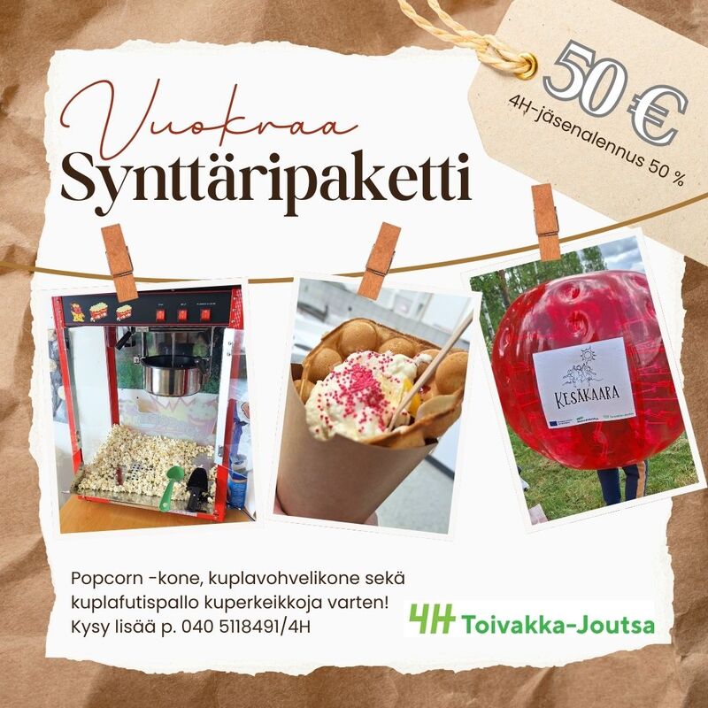 Vuokraa SYNTTÄRIPAKETTI, 50 €/vuokraus, jäsenalennus 50 % Paketti sisältää popcorn -koneen, kuplavohvelikoneen sekä kuplafutispallon kuperkeikkoja varten! Kysy lisää p. 040 5118491/4H