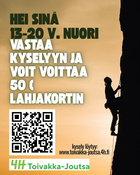 Jos olet 13-20 vuotias ja asut Joutsassa tai Toivakassa, vastaa tällä sivulla olevaan kyselyyn viim. 15.3. ja voita 50 € lahjakortti.